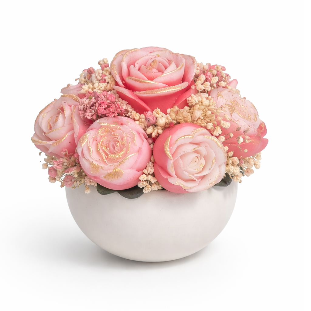 Con medidas aproximadas de 10×10 cm (puede variar ligeramente por su elaboración manual), está compuesto por 7 flores de cera aromatizada que, al acercarlas, evocan el aroma suave de una flor real. Se complementa con flores preservadas que aportan textura y naturalidad.