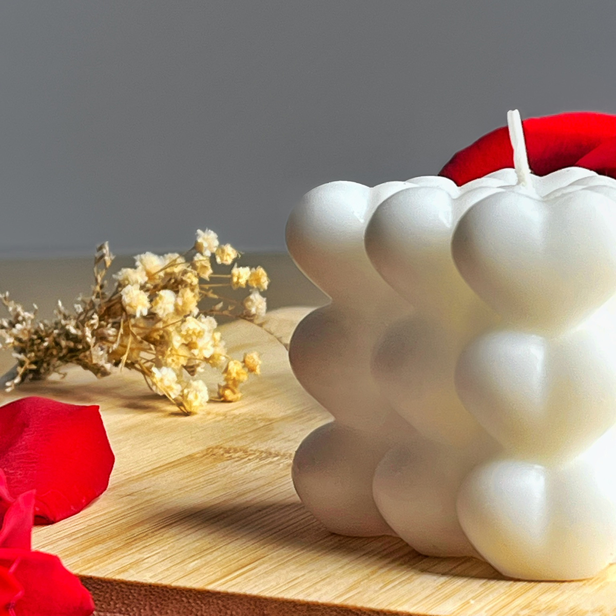 Elaborada artesanalmente con una delicada mezcla de cera vegetal y parafina, esta vela sin aroma destaca por su forma de corazones burbujeantes que transmiten ternura, armonía y encanto.