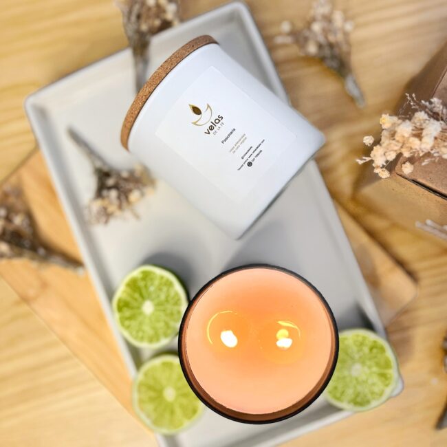 Cada vela es hecha con dedicación por artesanos colombianos, incluyendo su tapa de corcho artesanal, que no solo complementa su diseño, sino que también protege la vela del polvo.