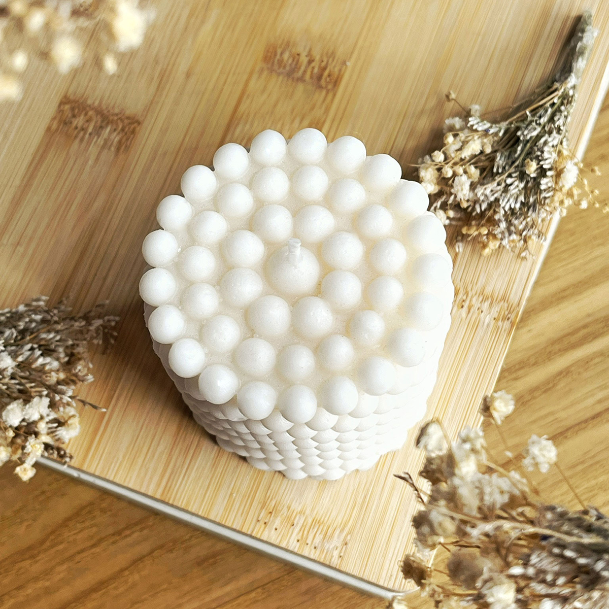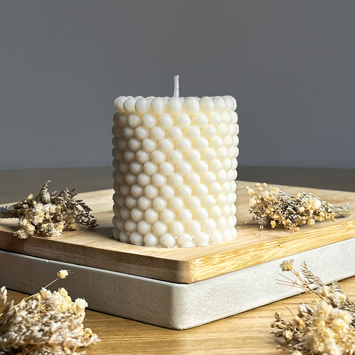 Vela artesanal elaborada con una delicada mezcla de cera vegetal y parafina, sin aroma y con una textura inspirada en el panal de abeja.
